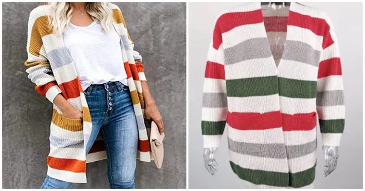 Chiziqli kontrast rang Chiziqli kardigan, rang-barang uslub diqqatni jalb qilish oson-, bu chiziqli kardigan yangi dizayn boʻlib, bahor va yoz uchun mos keladi, tizzagacha uzunlikdagi chiziqli kardigan katta oʻlchamli trikotaj kozok, dam olish uslublari mashhur